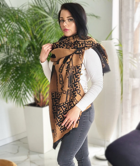 - Przepiękny damski szal wykonany z przyjemnego w dotyku materiału w brązowo czarnej kolorystyce.