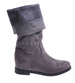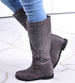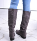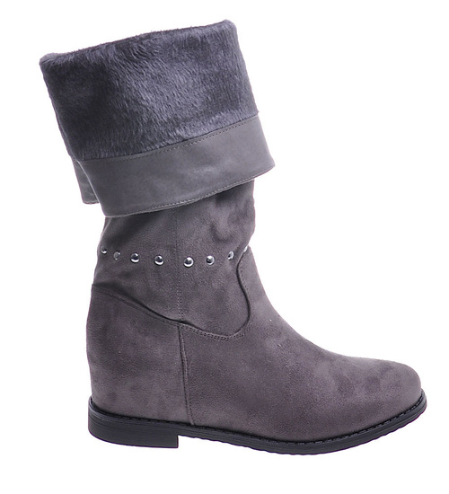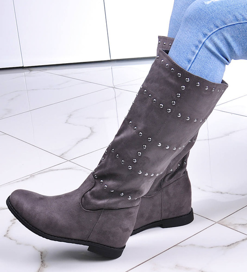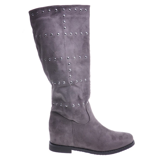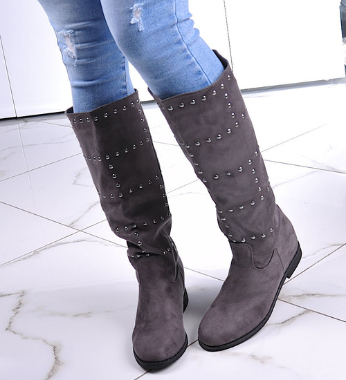- Casualowe damskie kozaki z ćwiekami wykonane z zamszowego materiału w kolorze szarym.