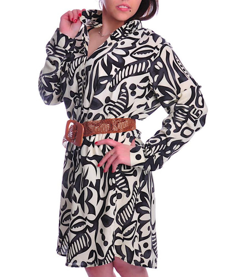 - Ciekawy, asymetryczny czarno beżowy wzór podkreśli kształty kobiecej figury.
