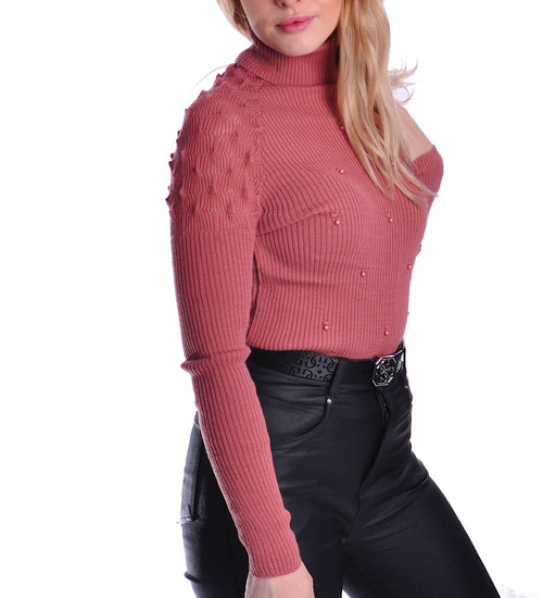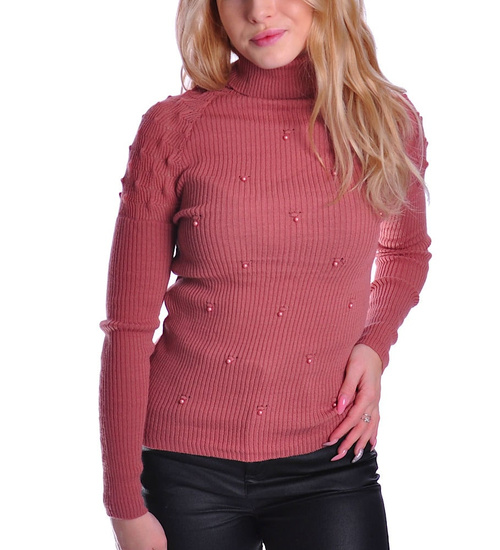 • Modny damski golf w kolorze brudnego różu ozdobiony delikatnymi perełkami.