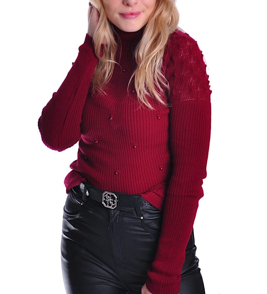 - Modny damski golf w kolorze bordowym ozdobiony delikatnymi perełkami.