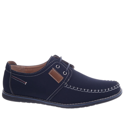- Sznurowane męskie półbuty wykonane z zamszowego materiału w granatowym kolorze.
