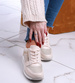 - Sznurowane damskie sneakersy z ażurowym wierzchem wykonane z beżowej skóry ekologicznej