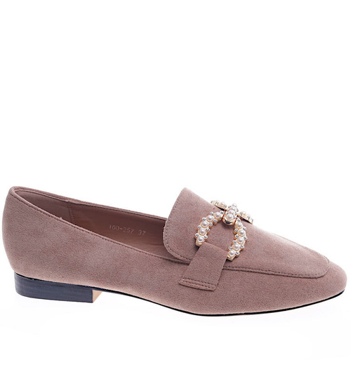 - Modne zamszowe balerinki lordsy ozdobione błyszczącymi perełkami, idelalne do wiosennych stylizacji.