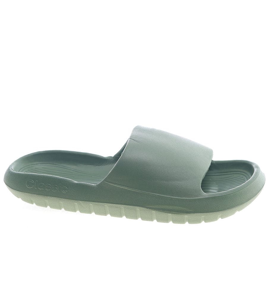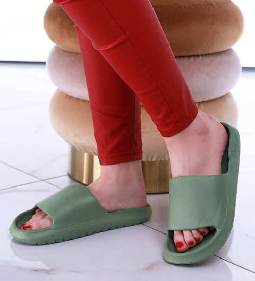 - Wodoodporne zielone klapki damskie wykonane z lekkiego, gumowo piankowego materiału.