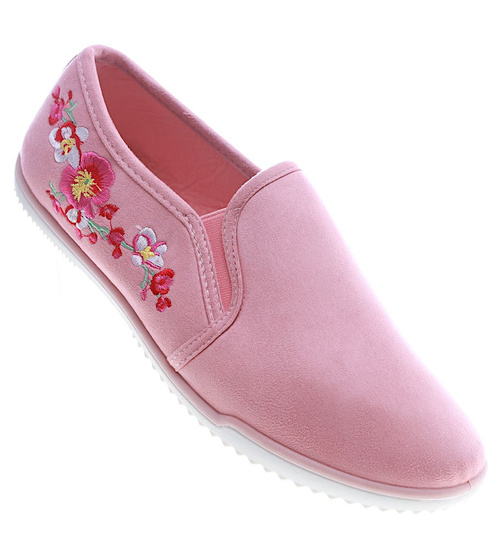 - Śliczne damskie różowe tenisówki z kolorowym kwiatowym haftem.