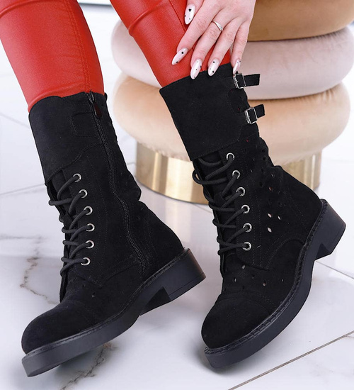 - Stylowe czarne damskie botki z ażurową cholewką- buty w militarnym stylu idealne do wiosennych topów.