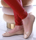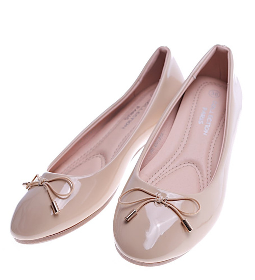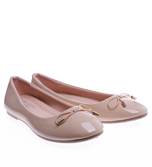 - Śliczne damskie balerinki wykonane z lakierowanej skórki ekologicznej w beżowym kolorze.