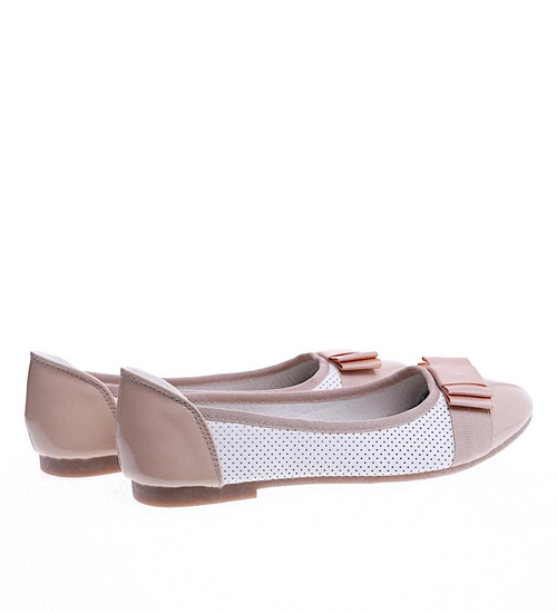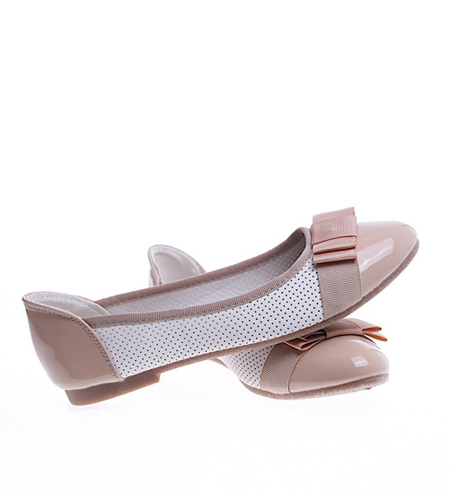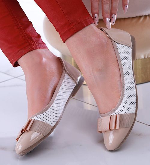 - Śliczne damskie balerinki wykonane z lakierowanej skórki ekologicznej w beżowym kolorze z dodatkiem bieli.