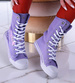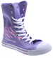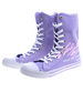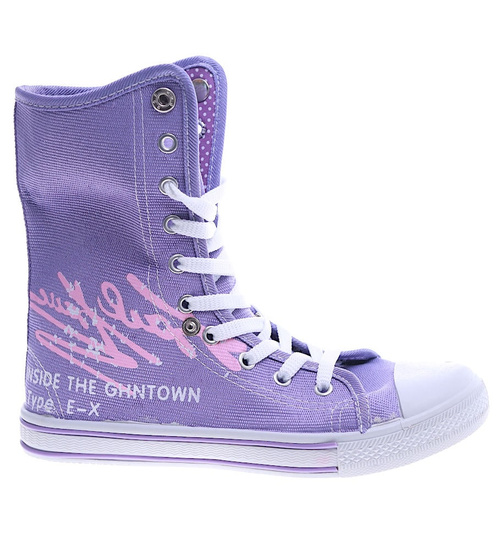- Fioletowe damskie trampki z wysoką cholewką zaopatrzone w sznurowadła.