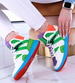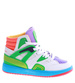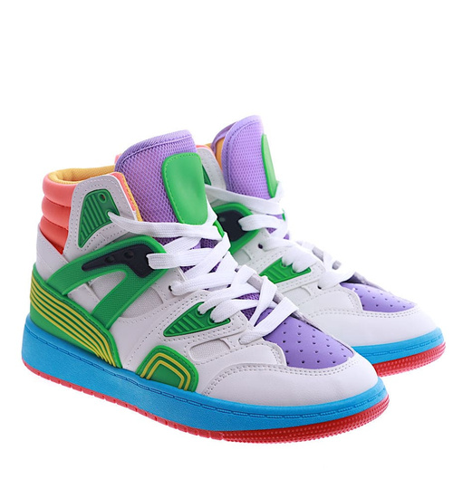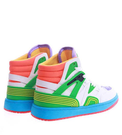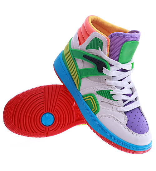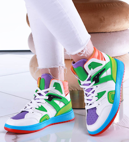 • Prezentowane trampki damskie z wysoką cholewką to modne buty w sportowym stylu, które wyróżniają się kolorowymi i jaskrawymi detalami.