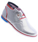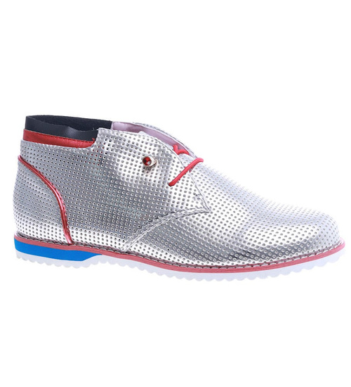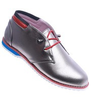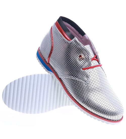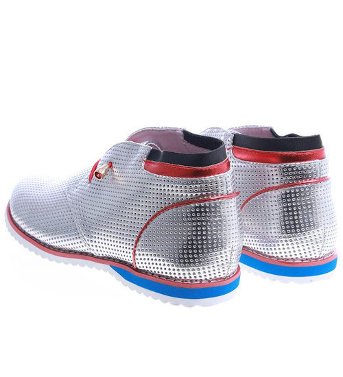 - Damskie półbuty z wyższą cholewką wykonane z błyszczącej skóry ekologicznej w kolorze srebrnym.