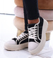 - Trampki posiadają kremową, wyższą podeszwę, która unosi sylwetkę o kilka centymetrów, noski są wzmocnione dodatkową warstwą gumy.