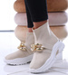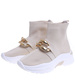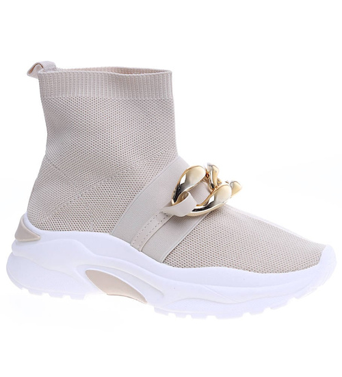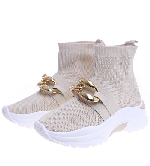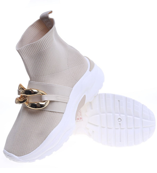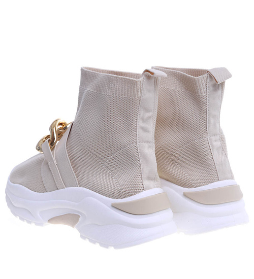 - Wysokie damskie trampki wykonane z miękkiego, elastycznego materiału w kolorze beżowym.