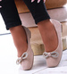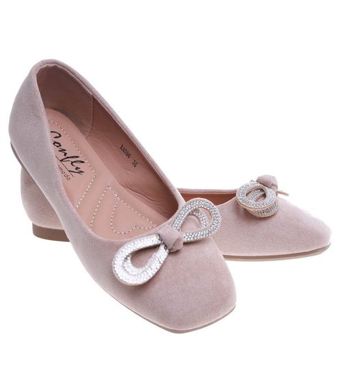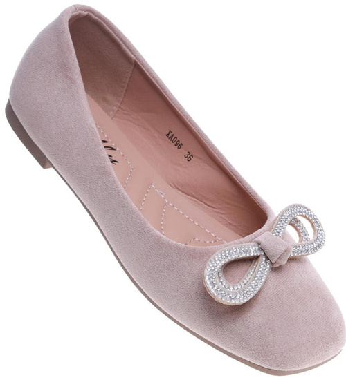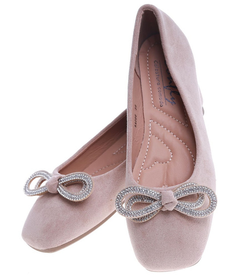 - Na noskach balerinek umieszczono błyszczącą kokardkę ozdobioną cekinami.
