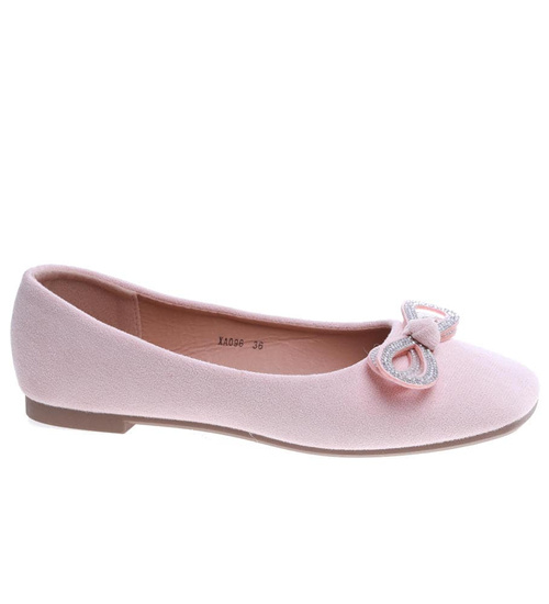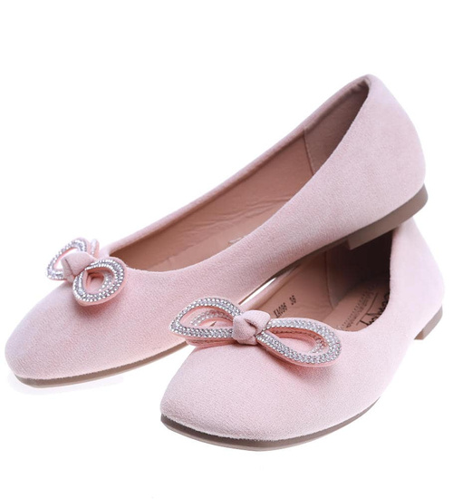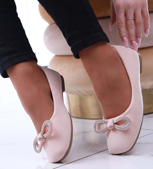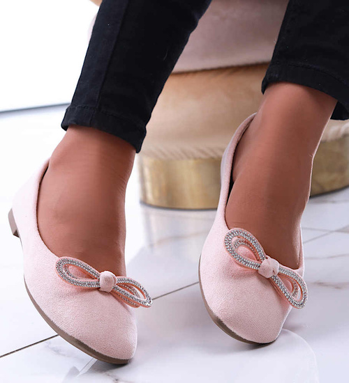 - Śliczne balerinki wykonane z zamszowego materiału w kolorze pudrowego różu.