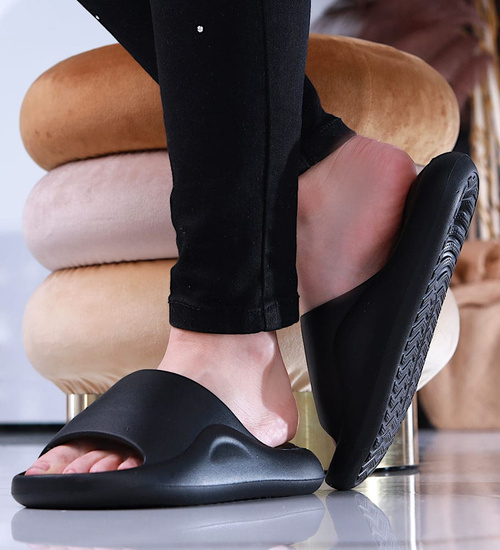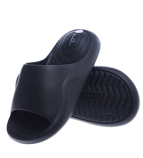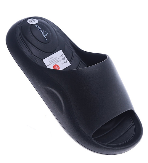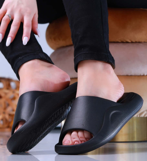 - Wodoodporne czarne klapki damskie wykonane z lekkiego, gumowo piankowego materiału.