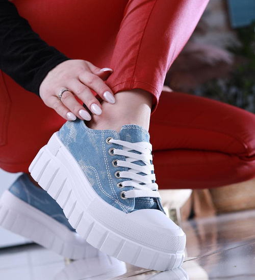 - Jeansowe damskie trampki postawione na elastycznej platromie w białym kolorze.