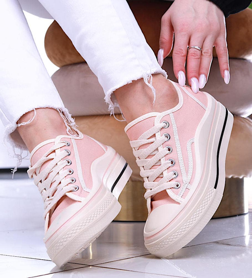 - Klasyczne damskie trampki wykonane z miękkiej tkaniny w różowym kolorze.