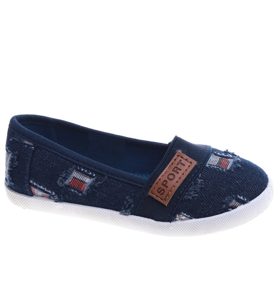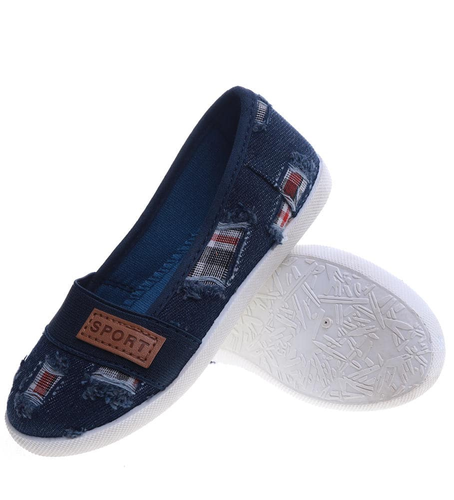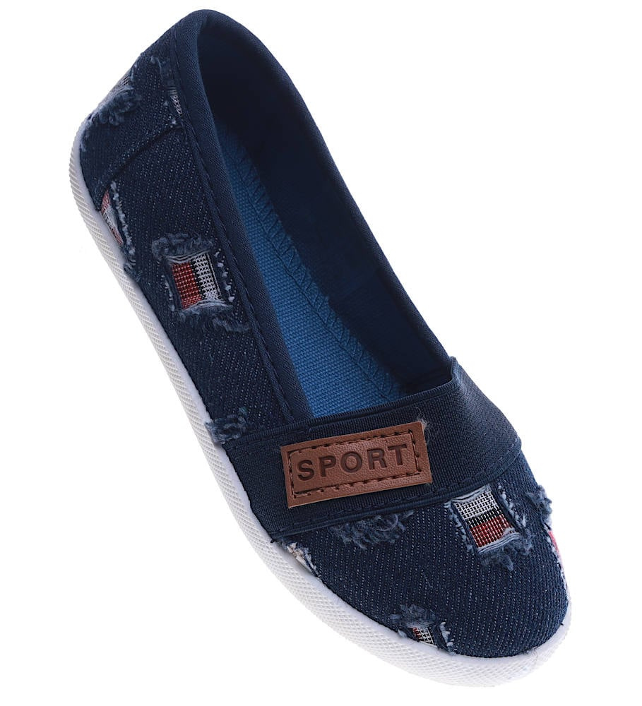 - Uniwersalne tenisówki dziecięce wykonane z miękkiego materiału w granatowym kolorze.
