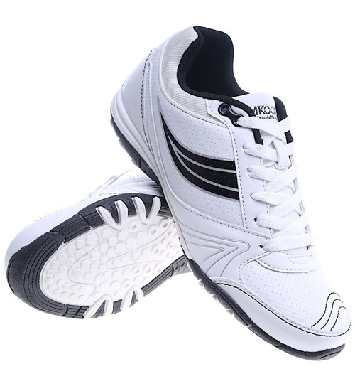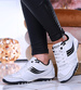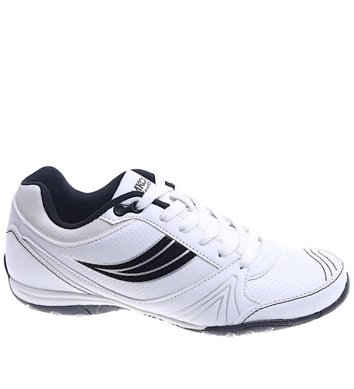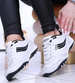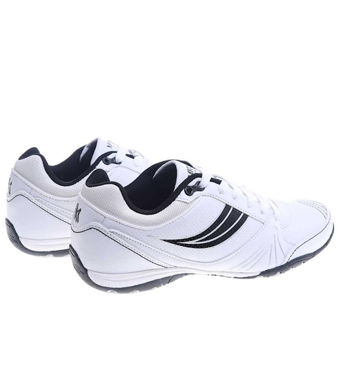 - Wiązane damskie buty sportowe w kolorze białym z czarnymi wstawkami.