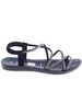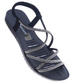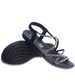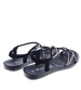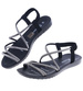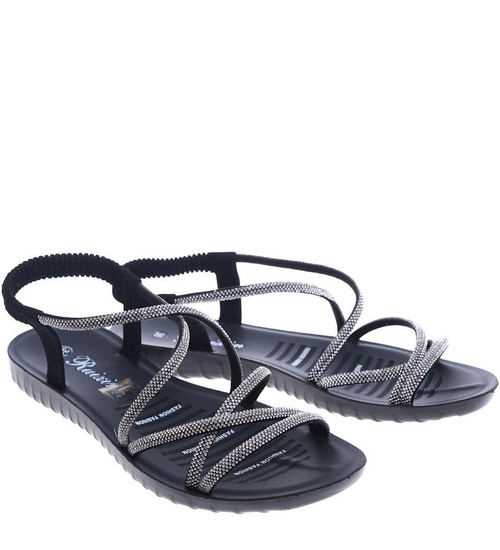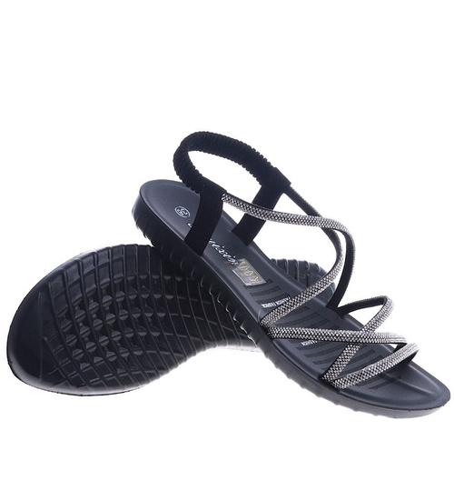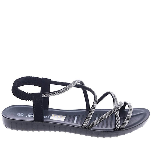 - Lekkie damskie sandały wykonane z czarnej skórki ekologicznej ozdobione błyszczącymi cyrkoniami.