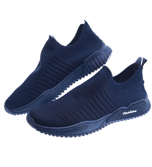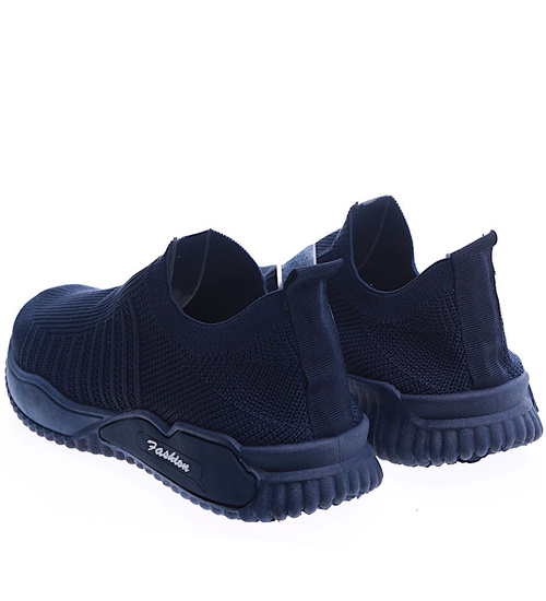 - Komfortowe męskie buty sportowe wykonane z elastycznego, miękkiego materiału w granatowym kolorze.
