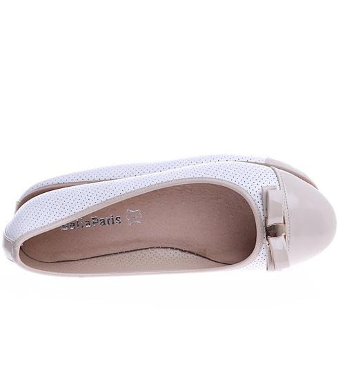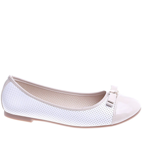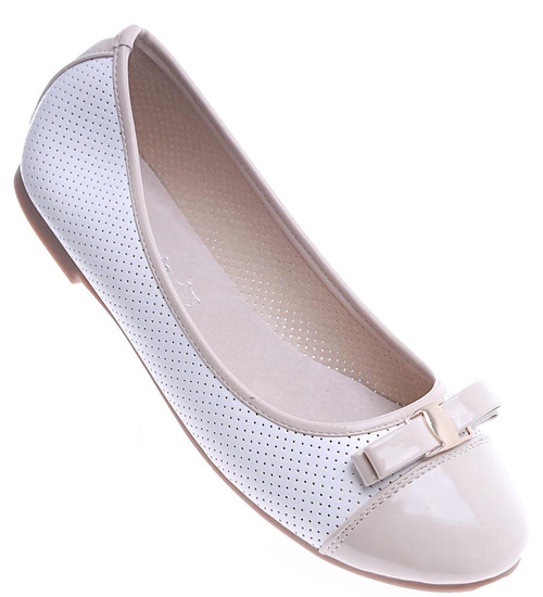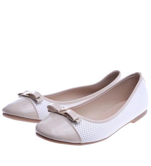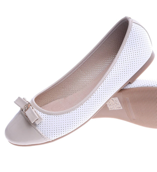 Ażurowe beżowe balerinki z kokardą /A8-3 14172 T198/