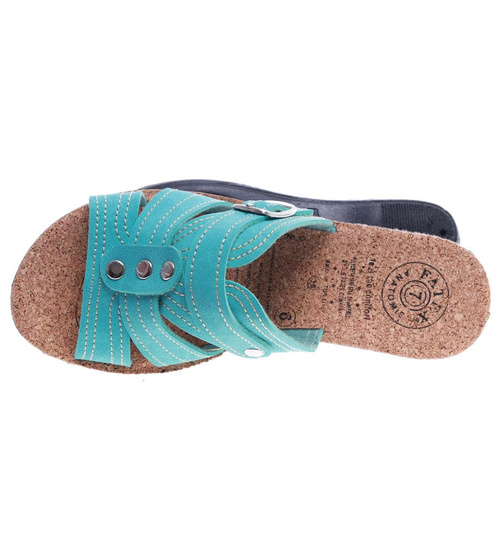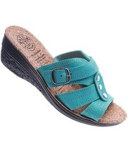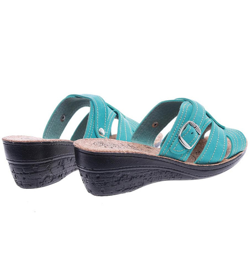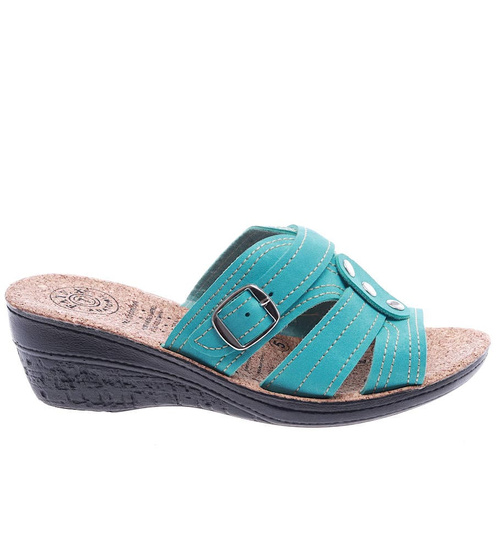 Turkusowe klapki na niskim obcasie z klamerką /H2 14309 T005/