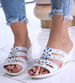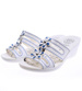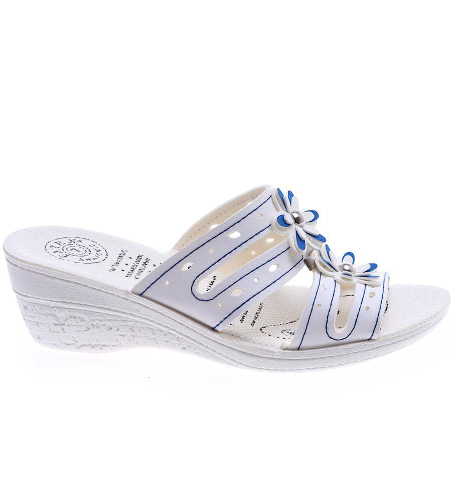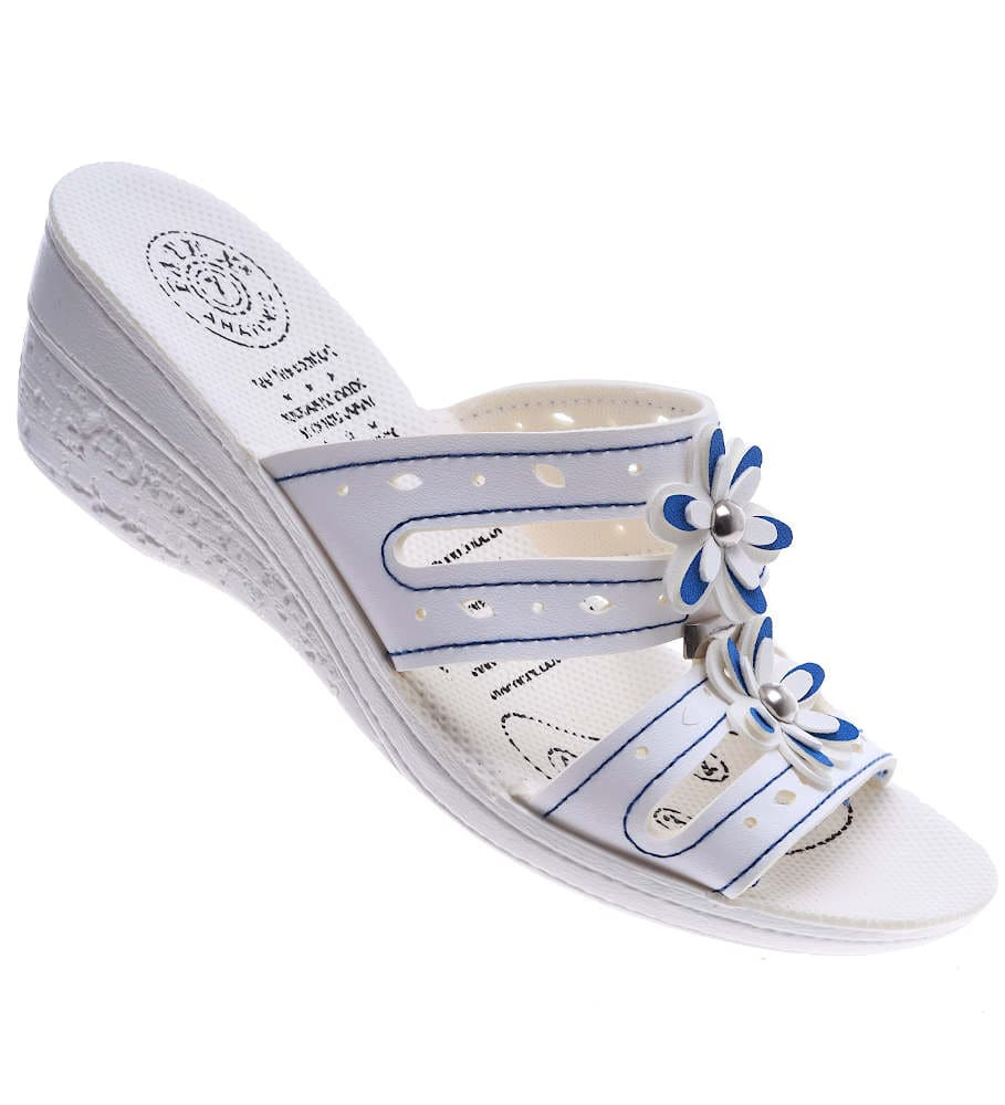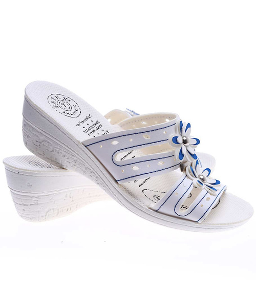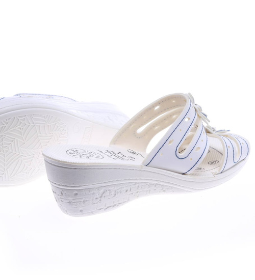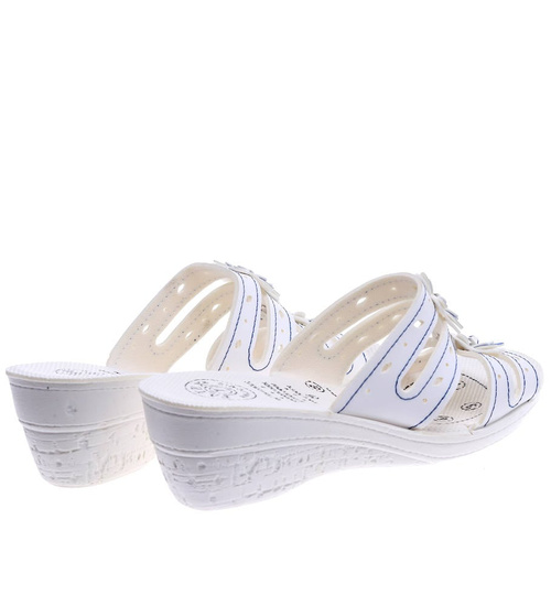 Białe klapki na koturnie z niebieskimi przeszyciami /H2 14302 T005/