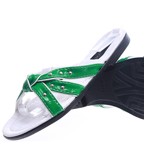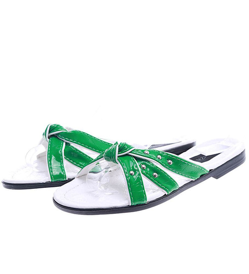 • Praktytczne damskie klapki wykonane z skóry ekologicznej w kolorze zielono białym.