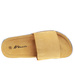 - Żółte damskie klapki postawione na platformie.