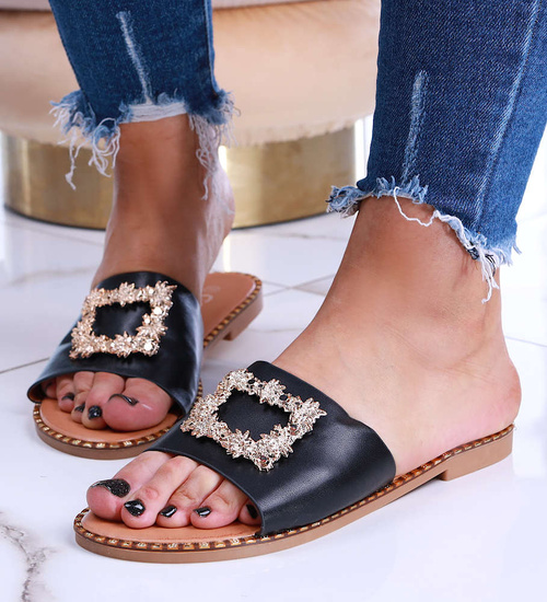 Płaskie czarne klapki z ozdobą /C6-2 14437 T346/