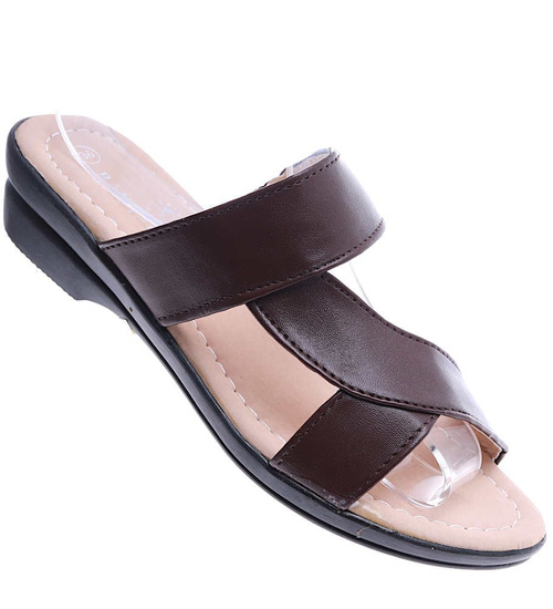 - Klasyczne brązowe klapki w casualowym wydaniu.