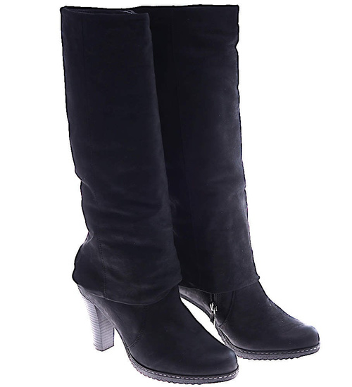 - Eleganckie damskie kozaki w kolorze czarnym wykonane z skóry naturalnej.