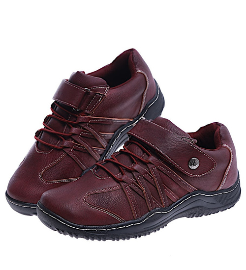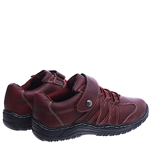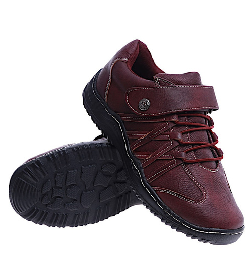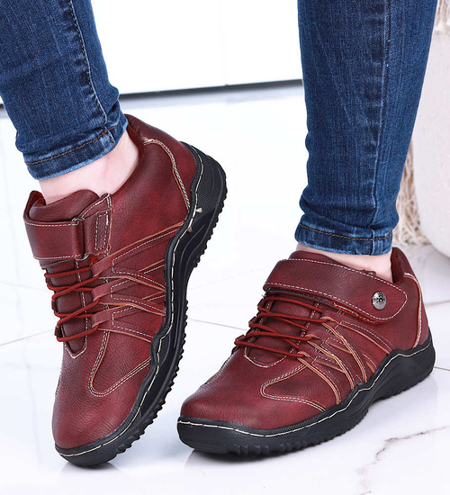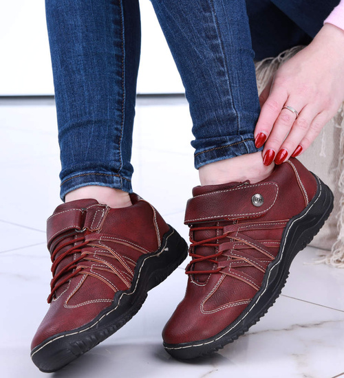- Bordowe buty damskie wykonane z materiału skóropodobnego- wygodne buty w umiarkowanej cenie.