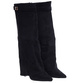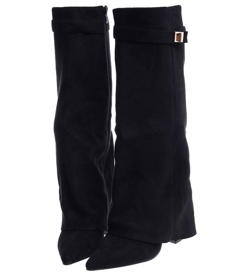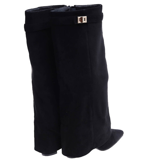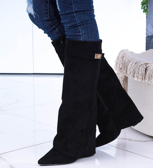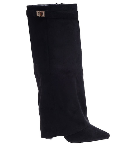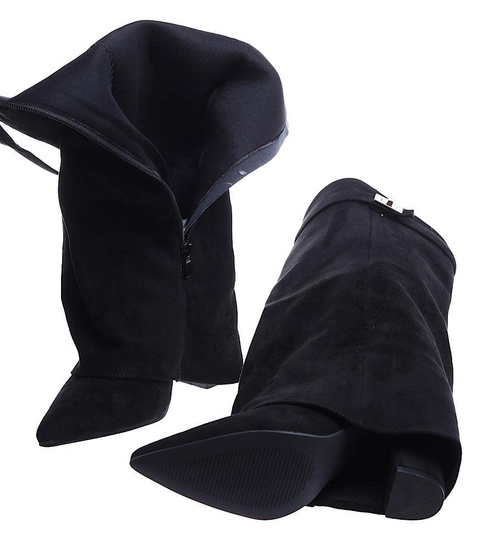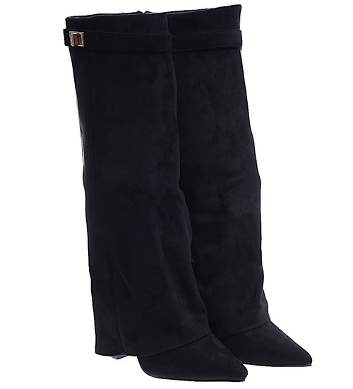- Designerskie kozaki na słupku wykonane z zamszowej skóry eko w kolorze czarnym- modne damskie buty do wyjściowych outfitów.