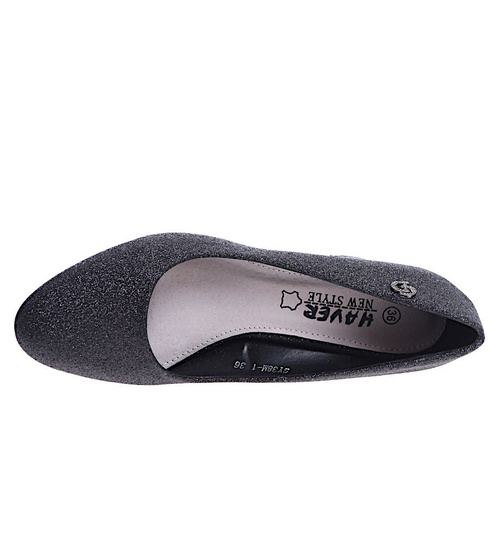 - Wierzch czółenek został wykonany z miękkiej skórki ekologicznej w kolorze czarnym z brokatowym wykończeniem.