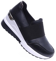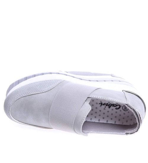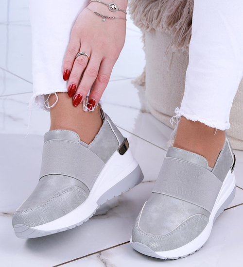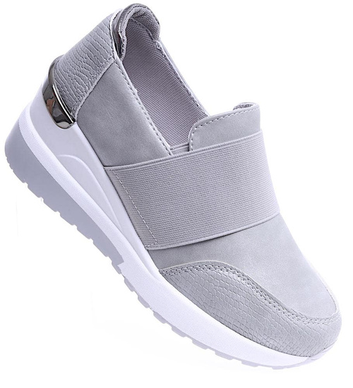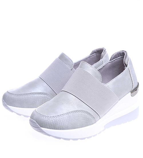 - Wsuwane szare trampki na koturnie wykonane z miękkiej skórki ekologicznej.