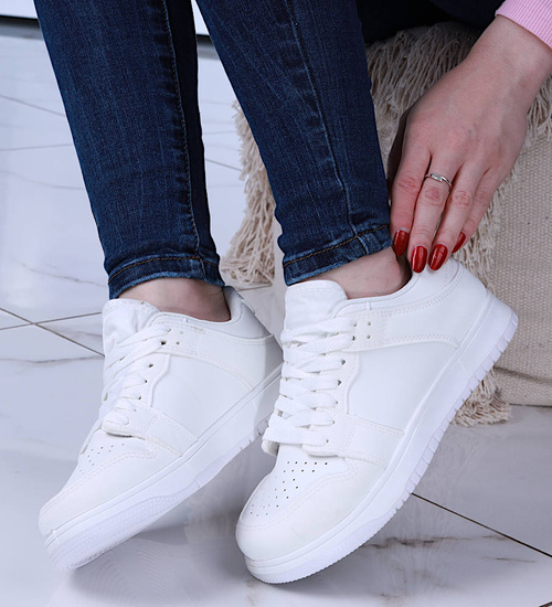- Wiązane damskie trampki wykonane z miękkiej skórki ekologicznej w kolorze białym.