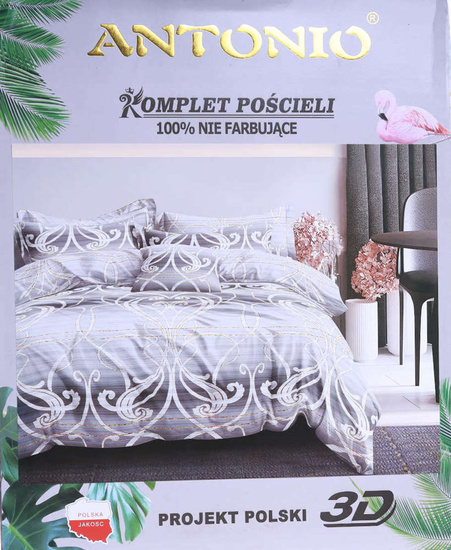 - Szary komplet pościeli z satyny bawełnianej z wzorem.