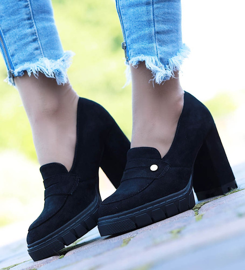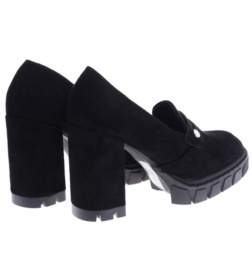 - Czarne czółenka damskie postawione na grubym, stabilnym obcasie w formie słupka.