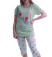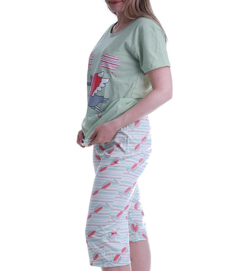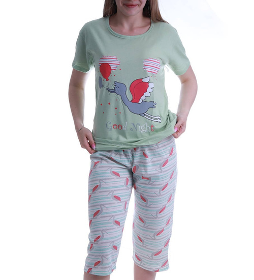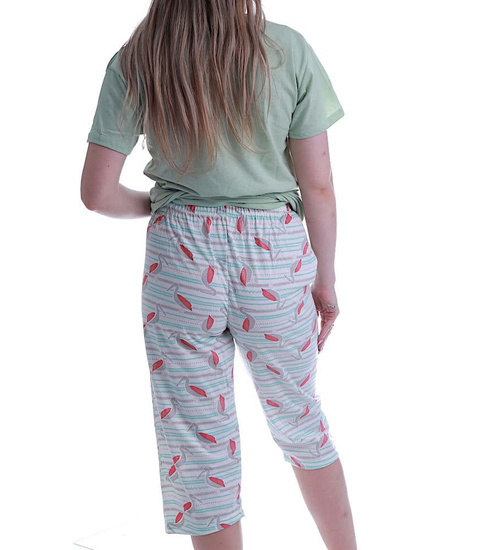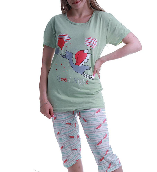 - Komfortowa damska piżama wykonana z wysokiej jakości bawełnianego materiałuz przewagą koloru jasno zielonego.