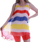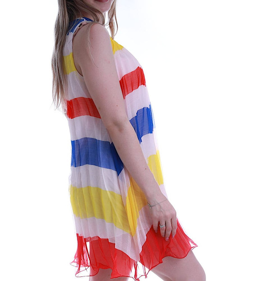 - Praktyczna damska sukienka wykonana z rozciągliwego materiału w kolorowe pasy.