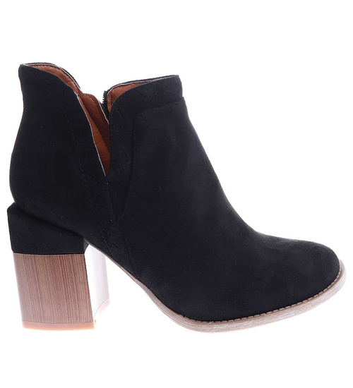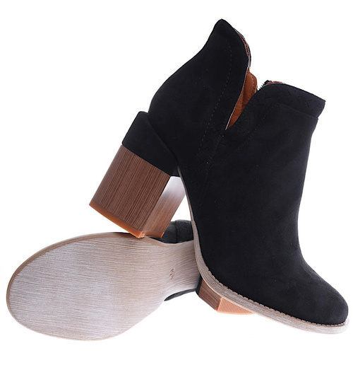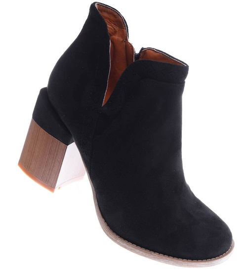 - Botki charakteryzują się modnym designem, który z pewnością przyciągnie uwagę. Częściowo otoczony zamszem obcas dodaje im elegancji, jednocześnie zapewniając stabilność. Cholewka została ozdobiona wyjątkowym wzorem, który nadaje tym botkom niepowtarzalny charakter i sprawia, że są one wyjątkowo atrakcyjne.