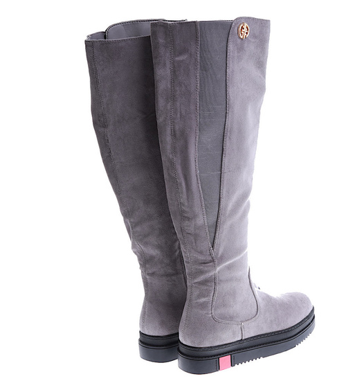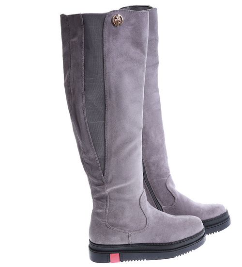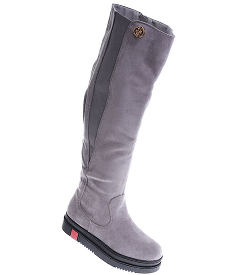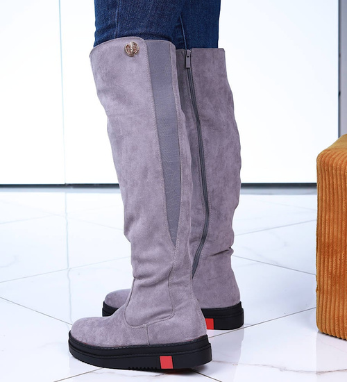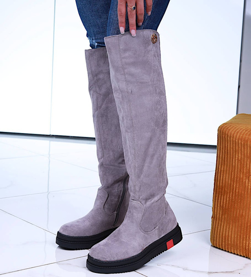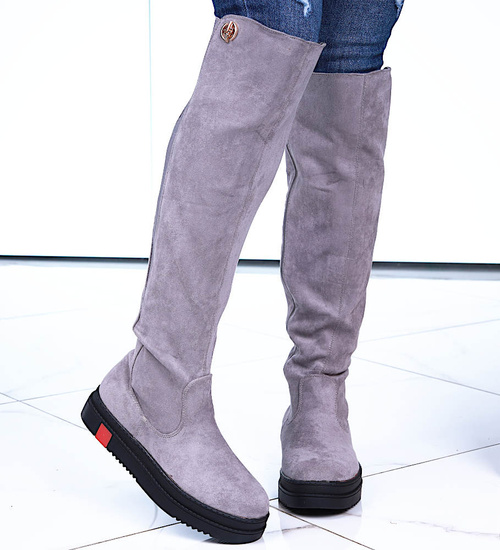 - Szare kozaki oficerki postawione na płaskim obcasie oraz platformie.