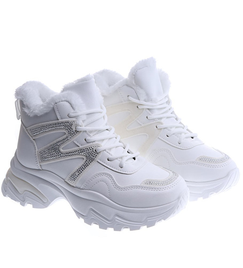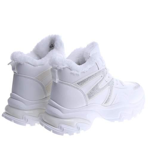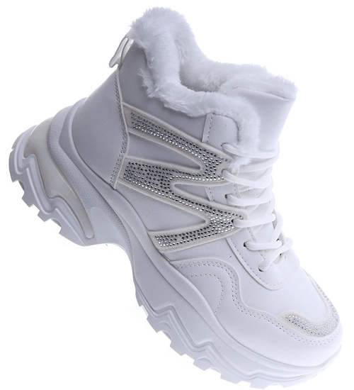 - Modne białe sneakersy na niskim koturnie ocieplone grubym futerkiem .