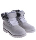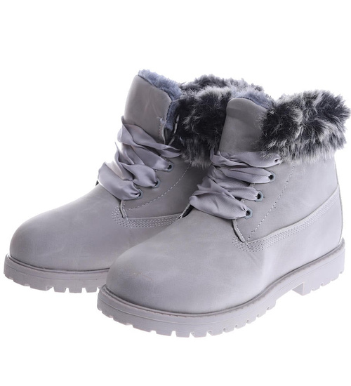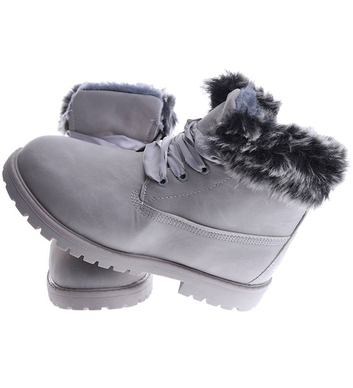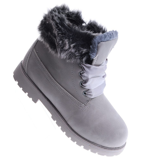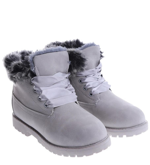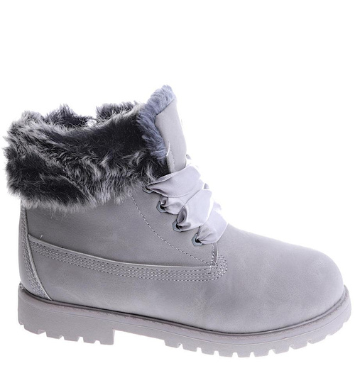 - Ocieplane dziecięce botki trapery wykonane z szarej eko skórki.