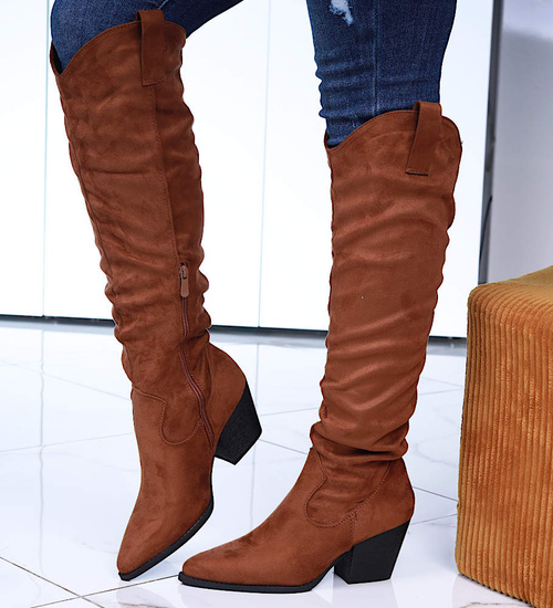 Camelowe kozaki damskie na słupku /F3-2 15002 T633/