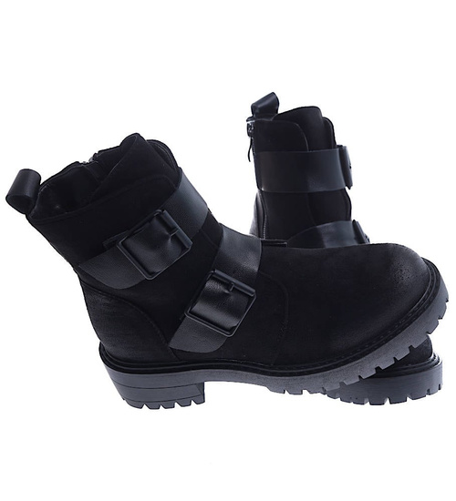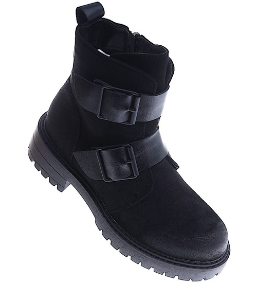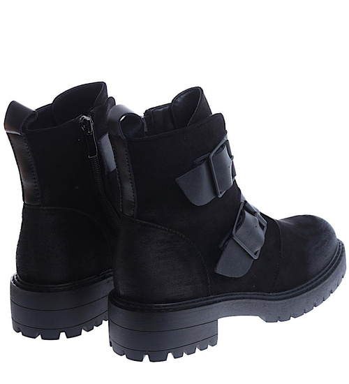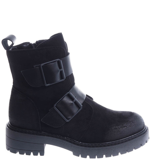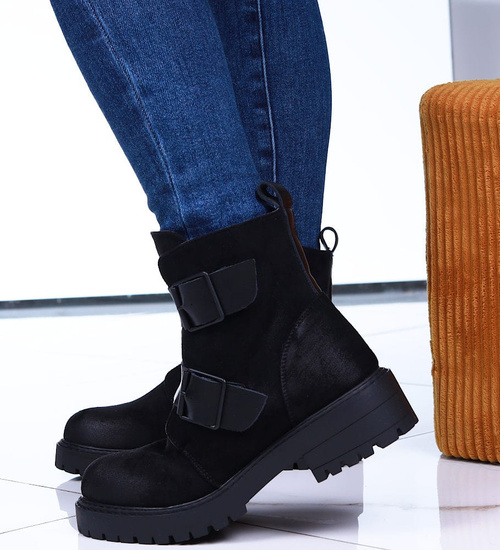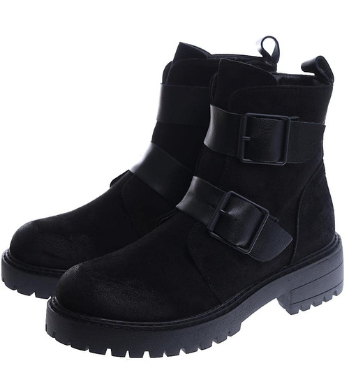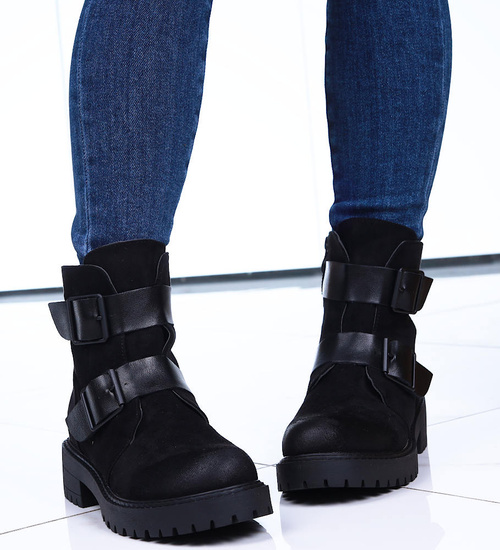 - Czarne zamszowe botki workery na niskiej platformie i płaskim obcasie.